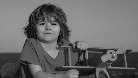 Child boy playing with wooden toy airplane, dream of becoming a pilot. Childrens dreams. Child pilot aviator with wooden plane.