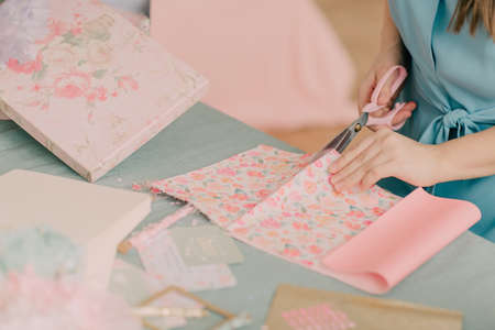 Scrapbooking. On a wooden background, a girl makes a photo album for a family in a vintage style. Top view