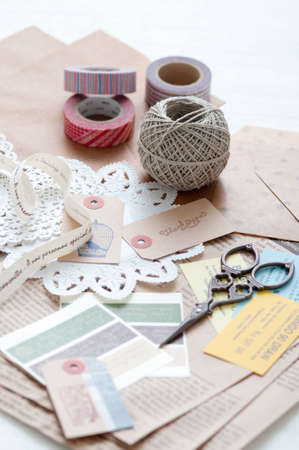 scrapbook background. process of creating a postcard - Card and tools with decoration