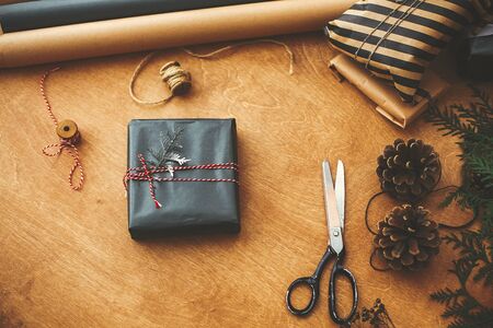 Stylish christmas gift box in black paper with pine branch and scissors