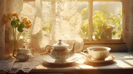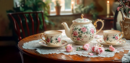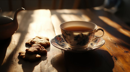 A cozy tea time setup with floral teacups, a rustic wooden table, and warm lighting for a nostalgic vibe.