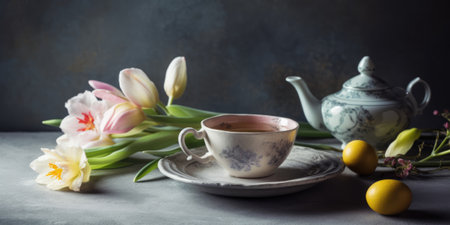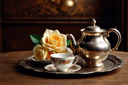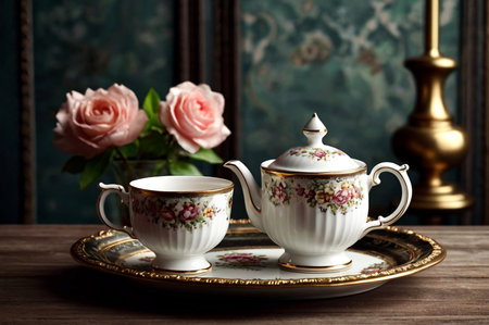 Still life of vintage teacup and teapot set. Copy space. Created using AI generated technology and image editing software.