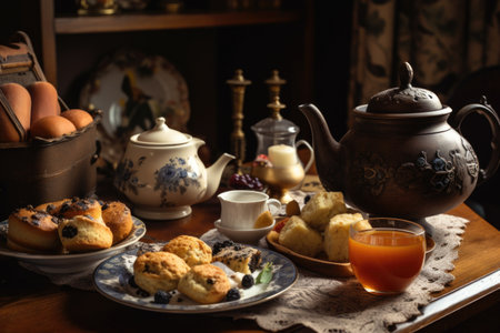 tea-time scene, with scones and muffins on table, and teapot in the background, created with generative ai
