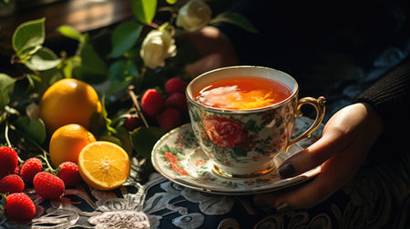 Still life flower tea. fruit blossom. Generate AI