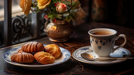 Delightful afternoon tea with scones and cup of steaming tea in a cozy, sunlit setting