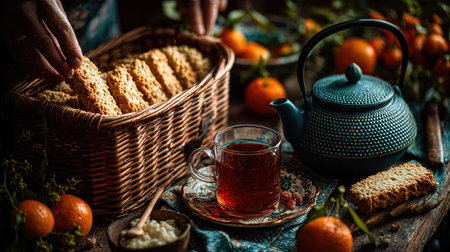 Enjoy a cozy afternoon tea scene featuring freshly baked cookies, a charming teapot, and vibrant citrus fruits, perfect for relaxation and comfort.