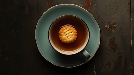 Top view of a cup of English tea with a saucer and a biscuit, with ample copy space.