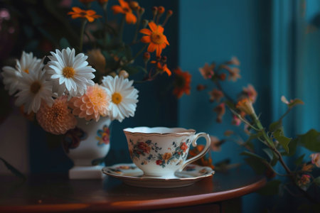 A delicate porcelain tea cup with floral patterns sits beside a vase of vibrant flowers on a wooden table The background features a soft blue hue, enhancing the serene atmosphere