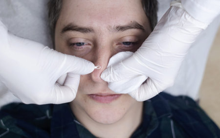 Close-up digital rendering of a human nose, highlighting a specific area, possibly indicating a health issue or medical procedure. The image conveys concepts related to respiratory health.