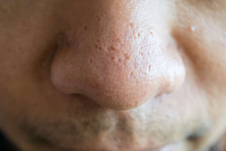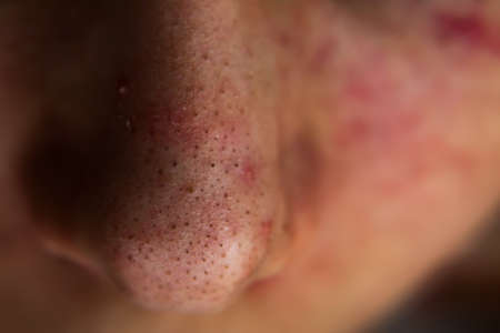 Close up shot of acne scars on man nose. Scars are formed when a breakout penetrates the skin deeply and damages the tissues beneath it.