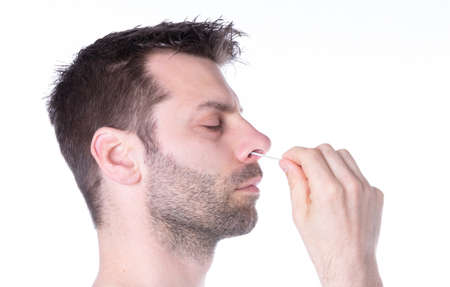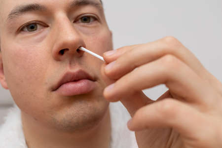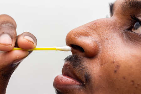 close up of asian man puts nasal swab into nose for COVID-19 self test