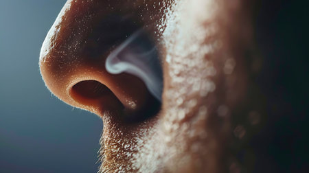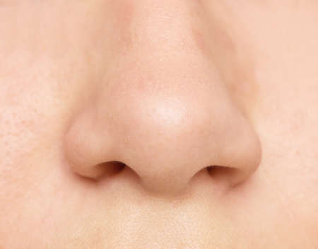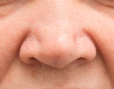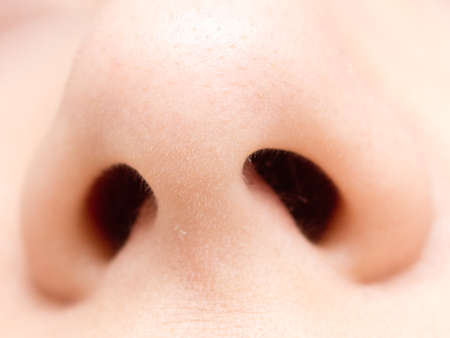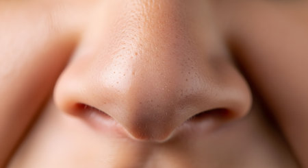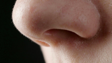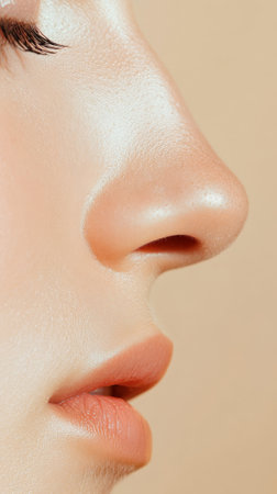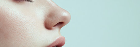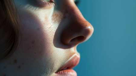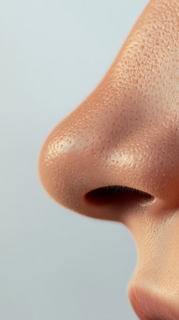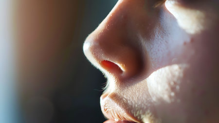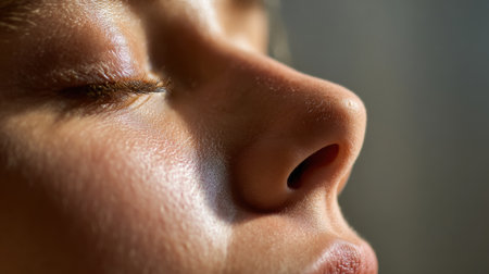 Close up of a womans nose breathing, showcasing delicate skin texture, nostrils, and pores, highlighting beauty, skincare, and the sense of smell