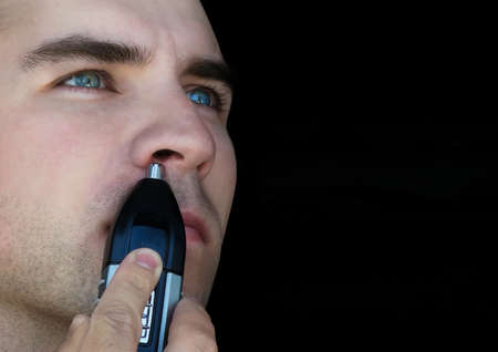 clean hair in the nose - Young bald man brushing hair in the nose by trimer isolated black