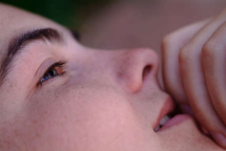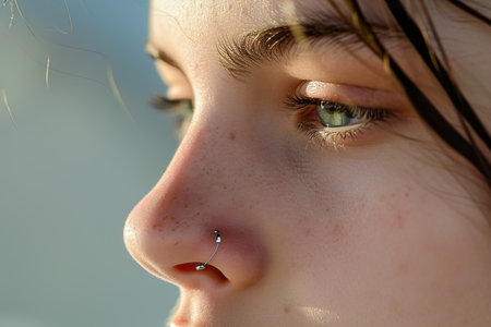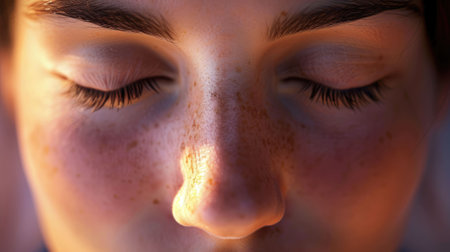Close up of a woman's nose. Shallow depth of field. sunshine on face