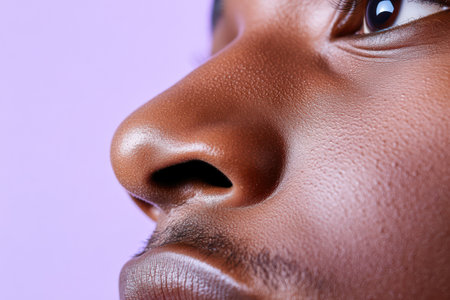 Macro detail of teenage boy nose with brown skin, illuminated softly, set against pastel lavender background with space for text.