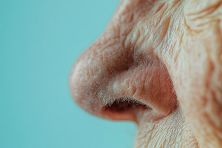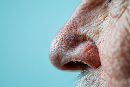 Hyper-detailed close-up of an elderly nose with visible pores, fine wrinkles, light age spots, and silver hairs, on pastel blue background.