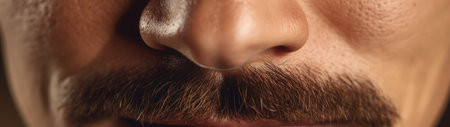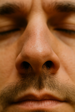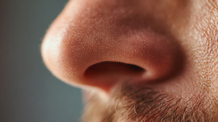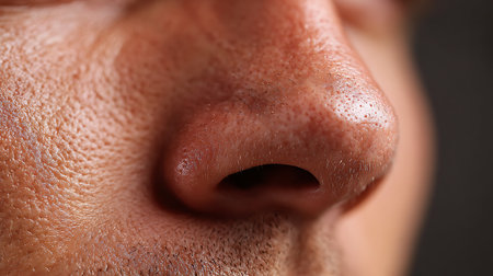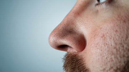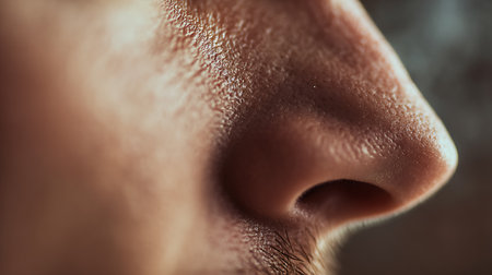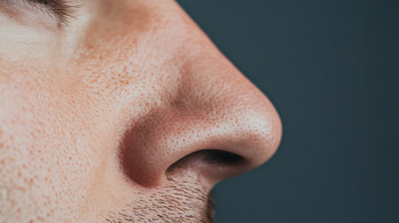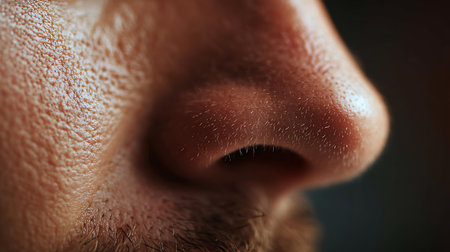 Close up of a caucasian mans nose, highlighting skin texture, pores, and subtle facial hair, potentially suitable for concepts related to rhinoplasty, cosmetology, or respiratory health