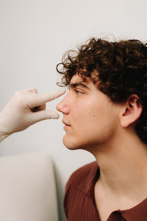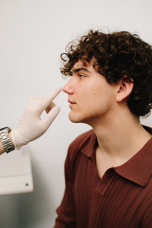 Rhinoplasty to change size or shape of nose and fix issues from injury or improve breathing problems. ENT doctor touching nose of patient before rhinoplasty or septoplasty surgery