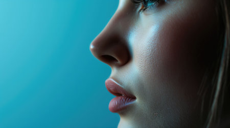 Profile view of a beautiful young woman breathing effortlessly, highlighting perfect features of her nose and lips after rhinoplasty surgery, embodying the essence of cosmetology and beauty