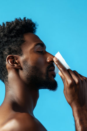 African American middle-aged man using facial oil blotting paper on his nose. The blue background adds a calm, clean vibe to his skincare routine.