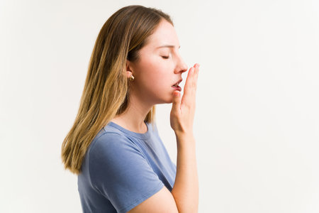 Side view of a good-looking woman putting her hand in front of the mouth and checking her bad breath before a date