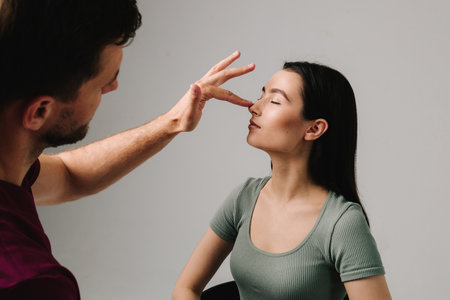 To guide her breath, an Asian lady touches her nostrils with her fingers. To get started with yoga and meditation