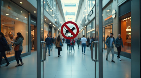 Clear glass door of a modern shopping mall shows a no dogs allowed sign with shoppers walking through the spacious interior.