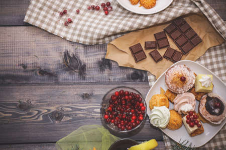 Close-up of sweets on a white plate: coconut pechente, pastila, meringue, cream roses, razat Turkish delight, near a broken chocolate bar on craft paper, in a bowl sesame cookie in a bowl on a linen flax napkin, fresh red cranberries, a glass with a dark drink decorated with a lemon slice little spruce branches. Festive pastry composition.