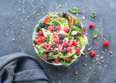 Delicious raspberry ice cream with pumpkin seeds and hempseed, decorated with blue cornflowers, black currant, sliced lemon on grey surface. Tasty dessert