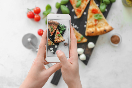 hand with smartphone photographing a plate of macaroni for upload to internet