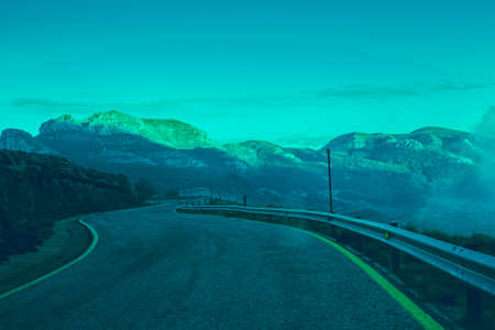 Winding mountain road in foggy day. Long exposure shot.