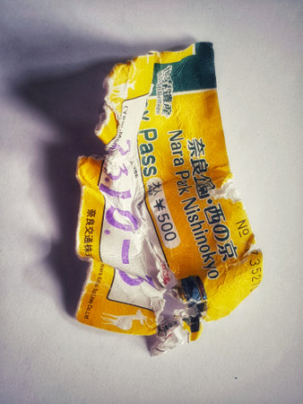 Bekasi, Indonesia on 15 Nov 2024. Close-up photo of a damaged yellow Nara Park Nishinokyo Pass ticket showing details like the price and number. Great for travel blogs or articles about Japan.