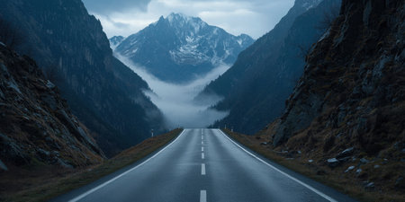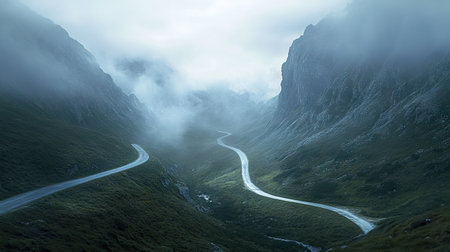 stunning mountain range with a ribbon of road winding through, surrounded by clouds and mist, created with generative ai