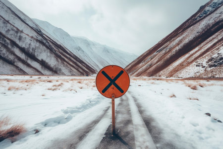 A stunning winter landscape featuring a winding road surrounded by snow-covered mountains under a dramatic cloudy sky, capturing the essence of solitude and tranquility in nature.