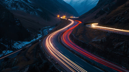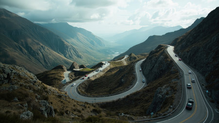 Embark on an unforgettable adventure with this stunning image of a winding road gracefully traversing the heart of rugged mountains. A scenic route unfolds, inviting cars to embark on a thrilling journey through a breathtaking landscape. Captured under a dramatic cloudscape with hints of daylight, this image perfectly encapsulates the spirit of adventure travel and exploration. Ideal for promoting tourism, showcasing travel destinations, or evoking wanderlust, this photograph offers a visual gateway to freedom and the beauty of nature.