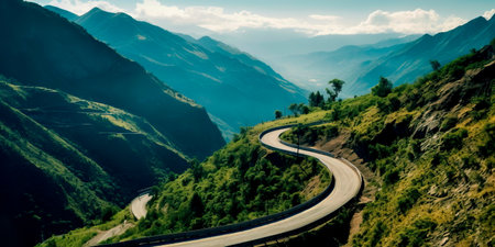Breathtaking Scenic Mountain Road Winding Through Lush Greenery with Majestic Peaks in Distance