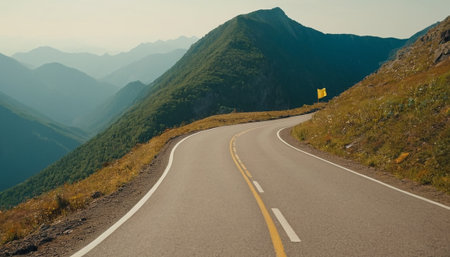 A tranquil highway cuts through a stunning mountainous landscape, enveloped in soft fog and lush greenery, evoking a sense of adventure and serenity.