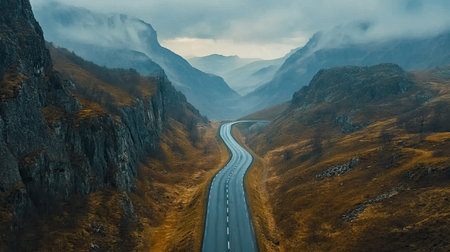 A breathtaking aerial view of a scenic road cutting through the misty mountains, with a dramatic sky in the background, highlighting the adventure of mountain travel.