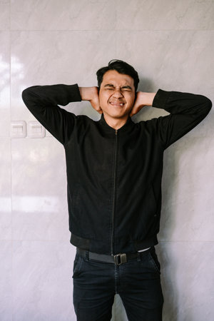 A young man stands against a wall, covering his ears with his hands, indicating frustration or annoyance from loud noise or stress. His eyes are tightly closed, showing discomfort.