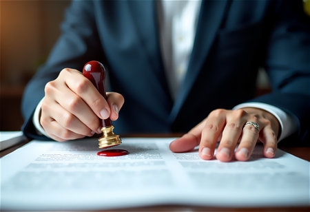 A close-up view of a man's hands dressed in an expensive business suit and a white shirt stamps documents that lying on the table with beautiful seal stamp.