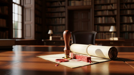 A cinematic wide environmental shot (16:9) capturing an official brass wax seal stamp and red sealin