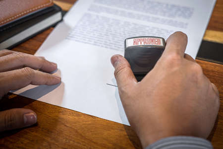businessman Hand notary public hand ink appoval stamper Stamping seal On Approved Contract Form documents contract, loan money concept
