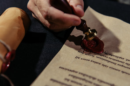 partial view of burred notary taking stamper near rolled contract with wax seal