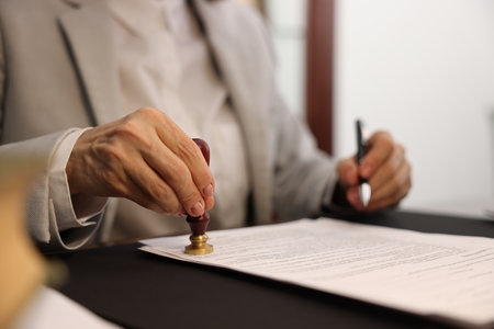 Closeup view of a beautifully embossed memorandum lying on the table illuminated by soft ambient lighting. A pair of hands adorned with an elegant watch gently presses a seal onto th