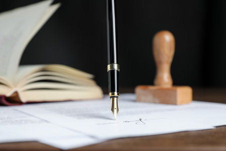 Notarys public pen and stamp on testament and last will. Notary public tools