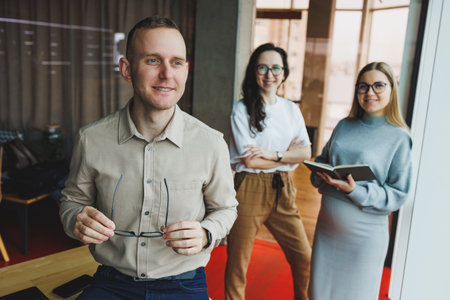 Young confident business people standing in an office space with a group of colleagues in the background, working on a laptop computer. The work of colleagues in a modern office.