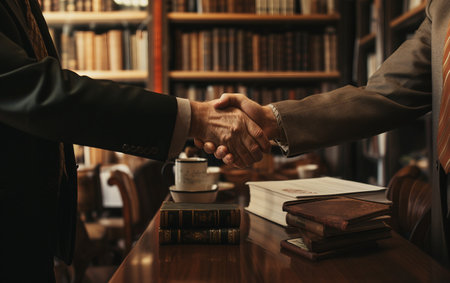 Business people or lawyers shaking hands finishing up meeting or negotiation in sunny office.
