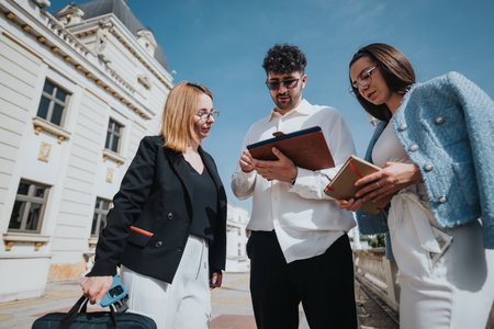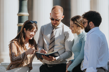 Business colleagues review documents outdoors, collaborating on a project during a sunny day meeting