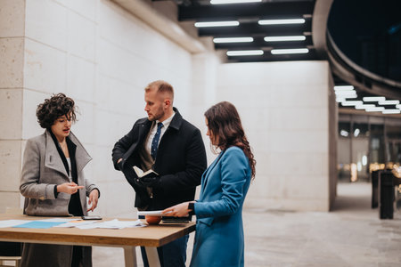 Three multiracial business partners deeply engaged in a discussion, standing in a well-lit modern office corridor with documents in hand.