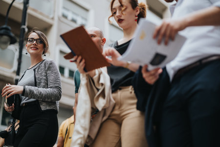 Professional business team walking and having a discussion outdoors